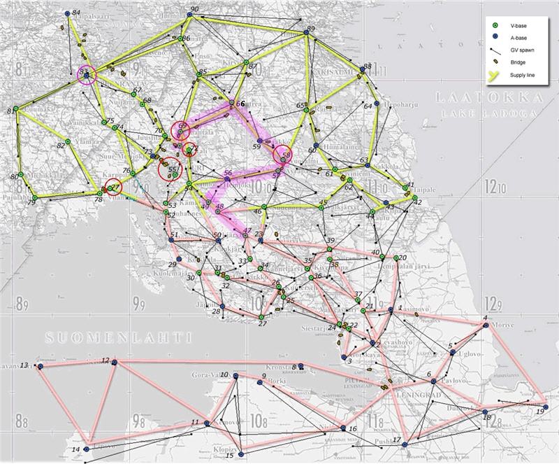 AGN/AGC did an excellent job carving out the purple path shown in the tactical map. Unfortunately, since the Finns recaptured v54, many of the captured bases will revert to Finnish control for frame 4 because of supply line rules. Still, at the end of frame 3, although the Russians will lose 56, 57, 58, 59, 66, 69, and 71 due to supply, we will get 53, 54, and 72. Also, we held 55. So, at the end of frame 3, we have two of four of the bases we need for victory.